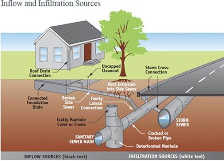 The excess clear water from I&I problems also uses sanitary sewer capacity needed for wastewater. The result is sewer backups and increased costs to homeowners and taxpayers for needlessly putting clear water through the wastewater treatment process.